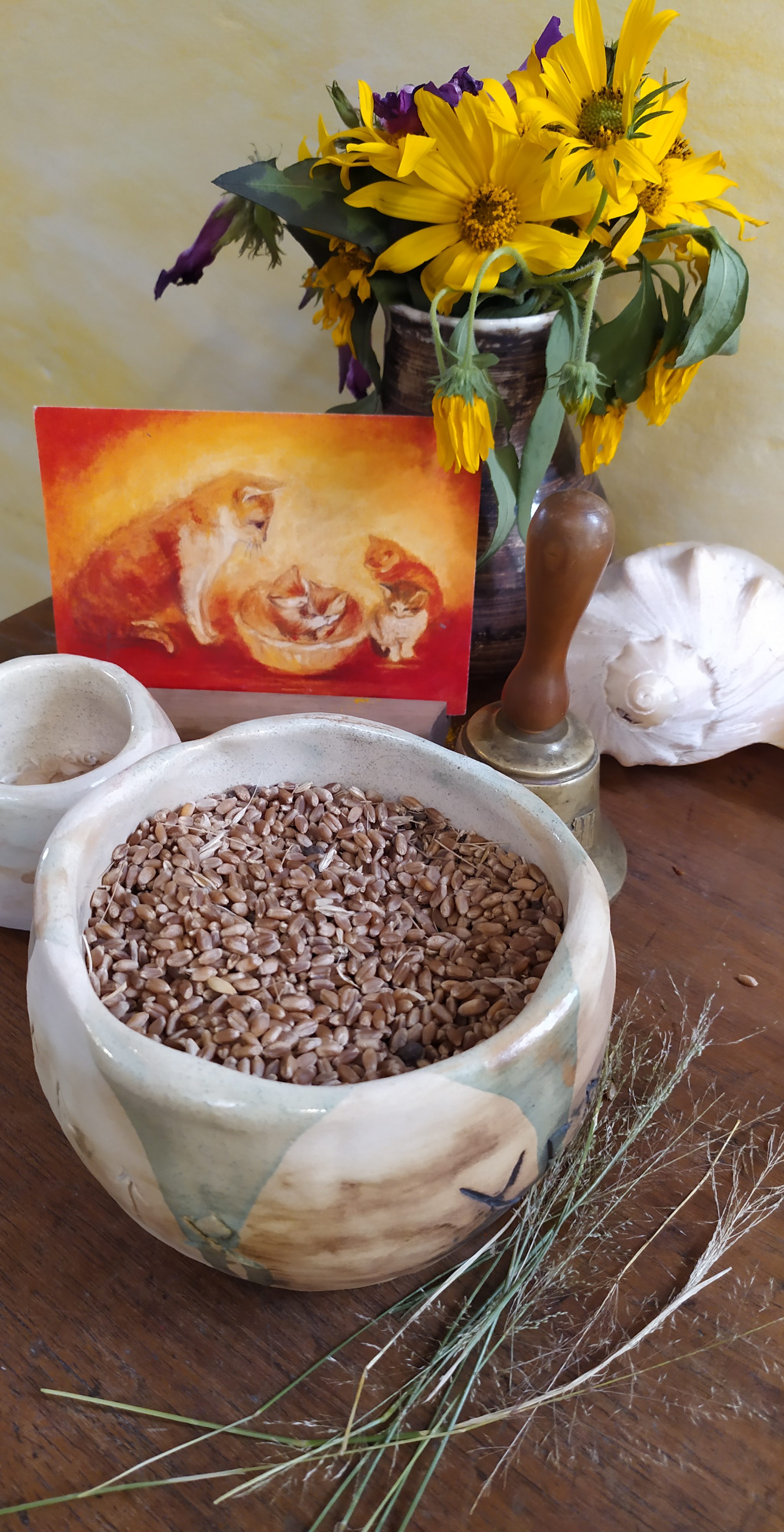 Luego de un año de trabajo, preparando la tierra, sembrando, viendo el trigo brotar tierno y verde claro, crecer verde oscuro, espigar, dorarse con el sol, cosecharlo y hacer gavillas, comenzamos este ciclo desgranando y moliendo para pronto hacer pan: la culminación de un proceso maravilloso que nos conecta con nuestra tierra y sus frutos, y nos llena de confianza en el destino.