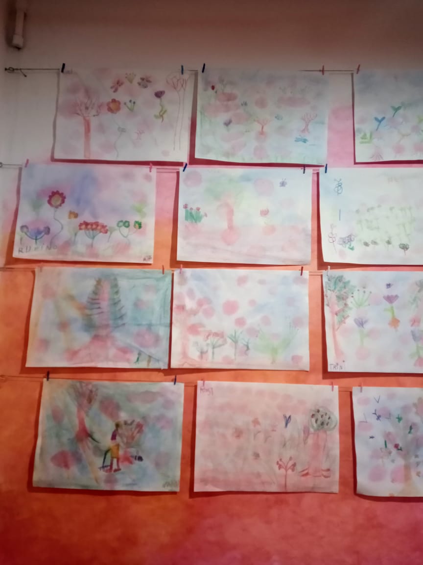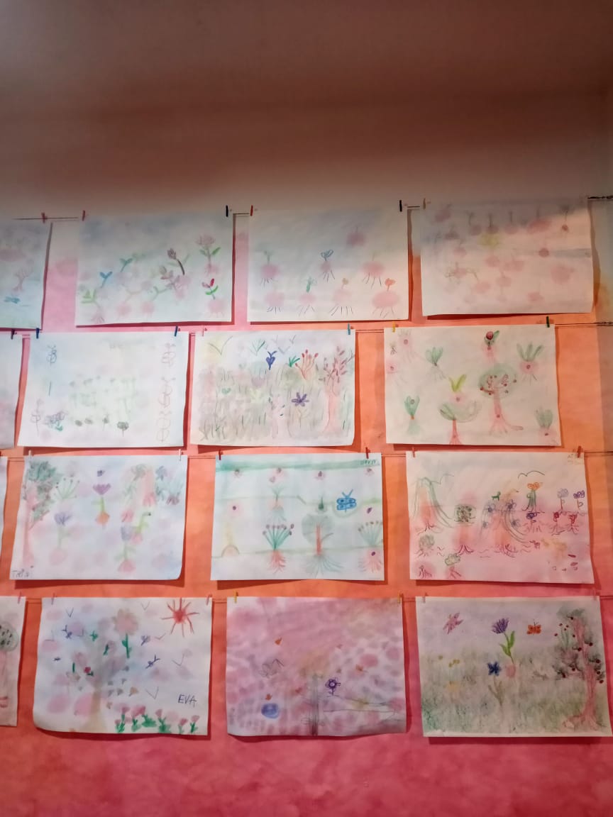 Cuando nos volvimos a encontrar con los niños y las niñas en la escuela, con pastas de colores, hicimos brotar hermosas plantas, flores y árboles de las semillas que habíamos plantado. Una mantis, mariposas, lombrices y hasta un enano, visitaron a los nacientes brotes.