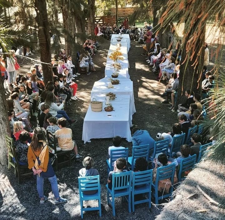 Y compartirlo para prepararnos para la Pascua. Pesaj, que significa Paso. El paso del verano al otoño, del afuera al adentro, de la cosecha al alimento… Dar el paso. Un paso hacia ser más humanos, más comprensivos, más amables… Invitamos en nuestra fiesta a los niños y niñas a pensar y sentir qué paso cada cual quisiera dar en su vida: desde lo más pequeño (poder escuchar mejor a la maestra, animarme a acercarme a un amigo con el que estoy enojado, intentar ser más paciente, etc).