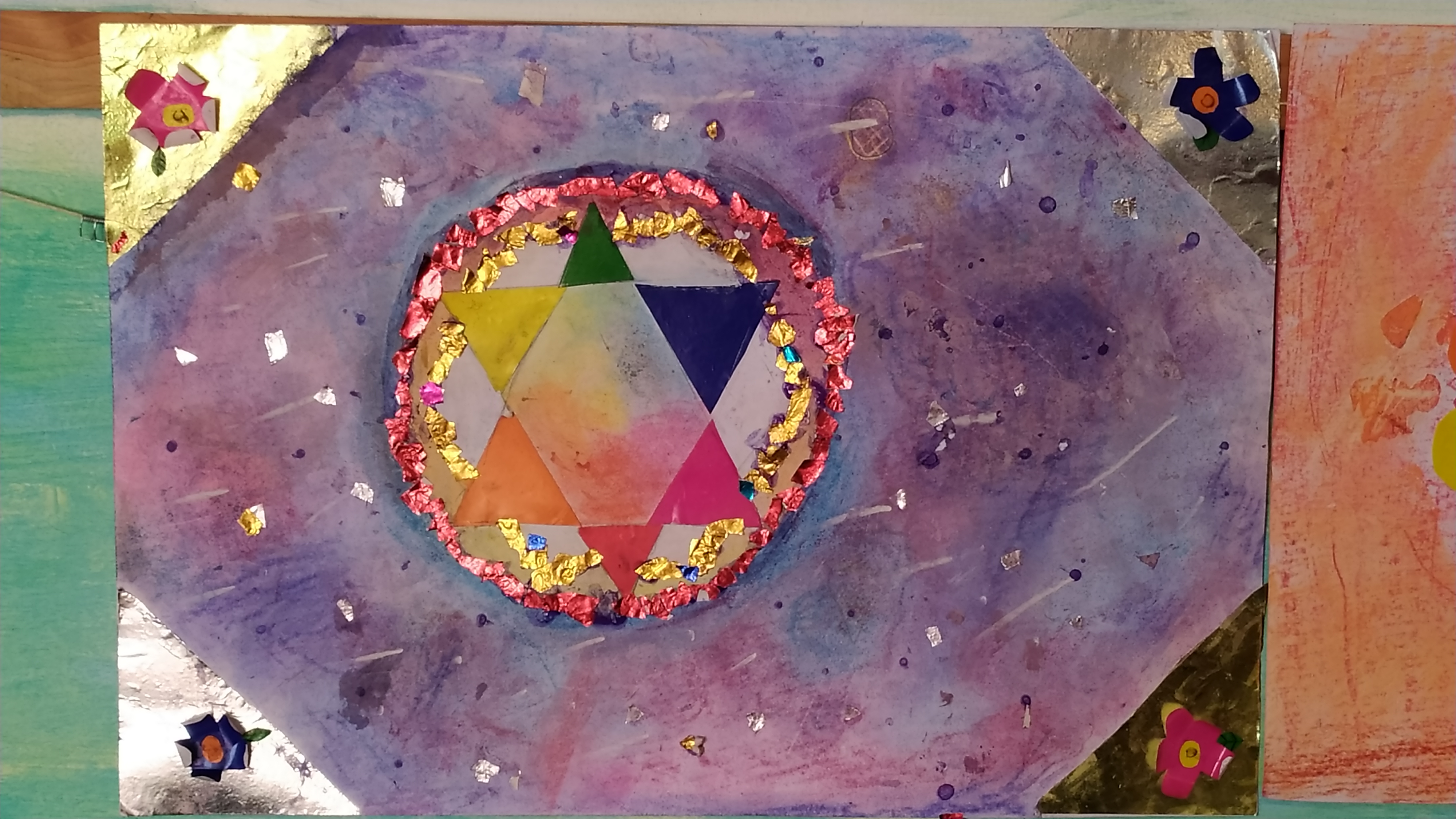 Para concluir esta época, los niños y niñas de quinto grado realizaron un trabajo de geometría artística en grupos. No solo tuvieron la posibilidad de crear formas bellas, poniendo en juego todo lo descubierto en relación a lo aprendido en la época, sino que el trabajo en grupo permite el encuentro y el desencuentro entre los niños: tener que acordar en el diseño, en los colores, distribuir tareas, lograr consensos, cuidar las palabras y los modos… Una gran oportunidad de desarrollo de las capacidades humanas necesarias para la vida social.