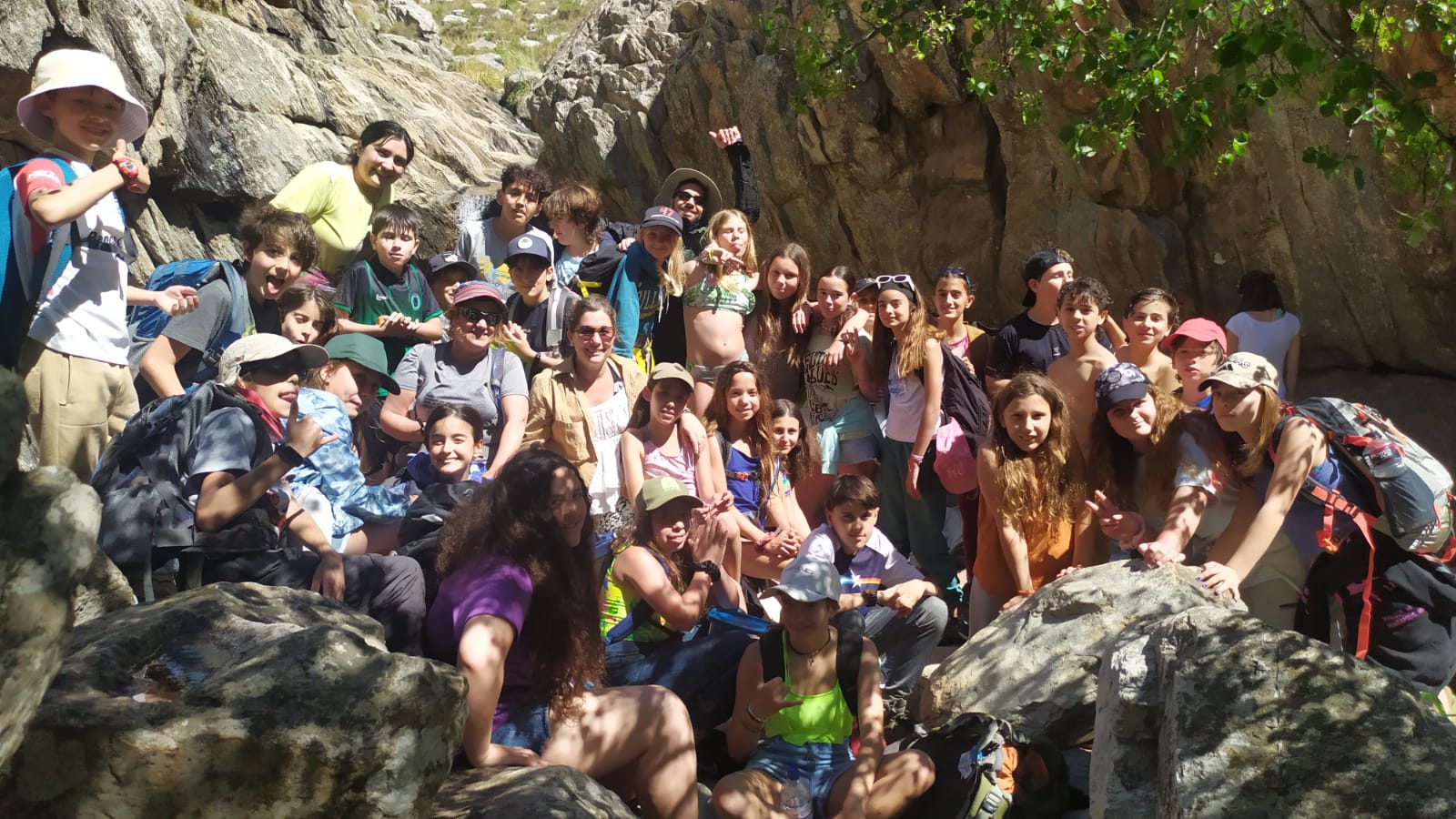 Sexto grado hace cima en el cerro Tres Picos, en Tornquist. La cima más alta de la Provincia de Buenos Aires. 32 niños y niñas, la maestra Florencia, la maestra Mariana del Grupo Terapéutico, los maestros ayudantes Yanina y Luciano, junto a los guías del lugar.