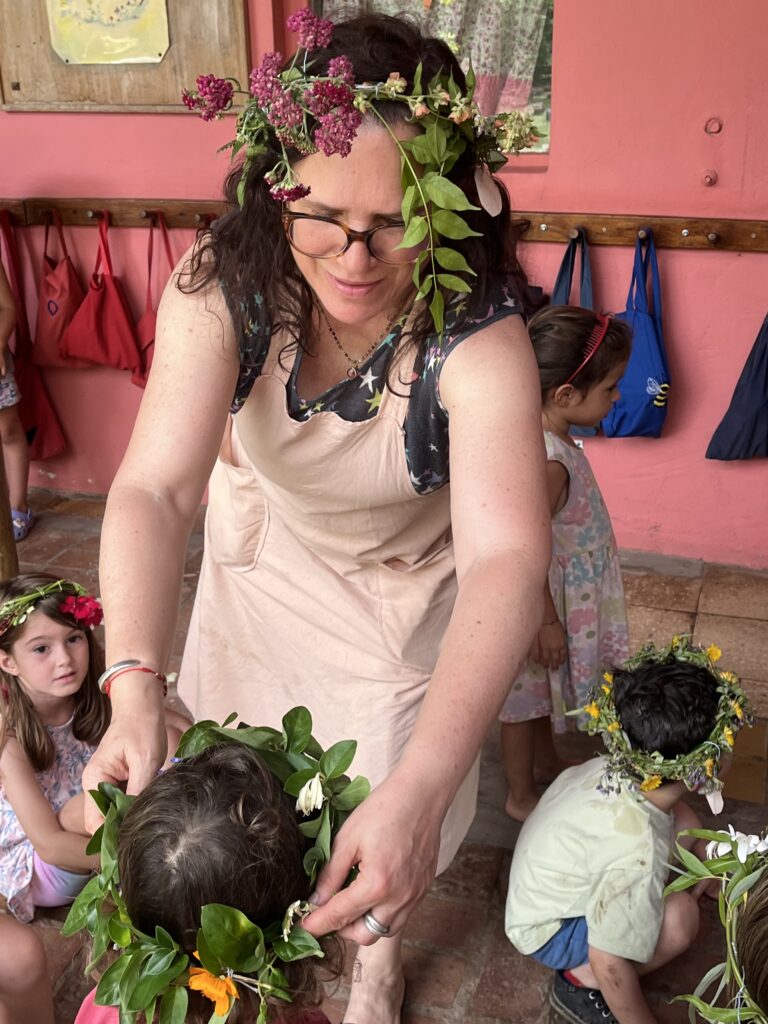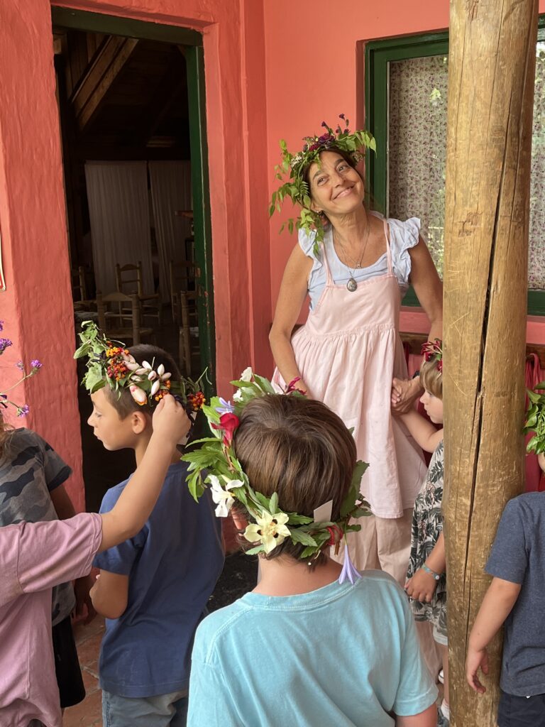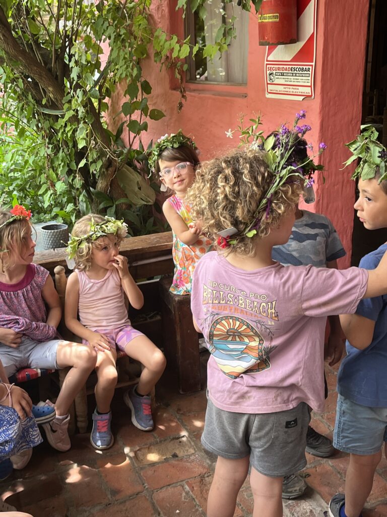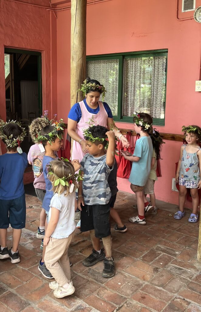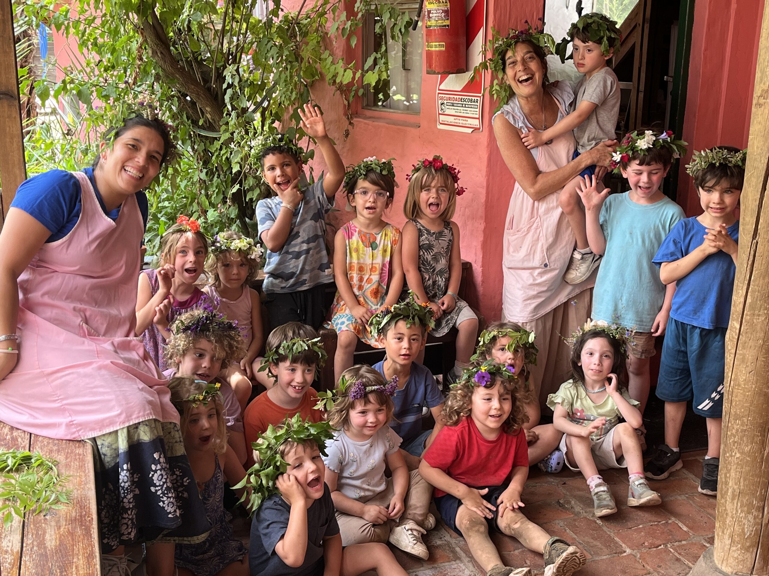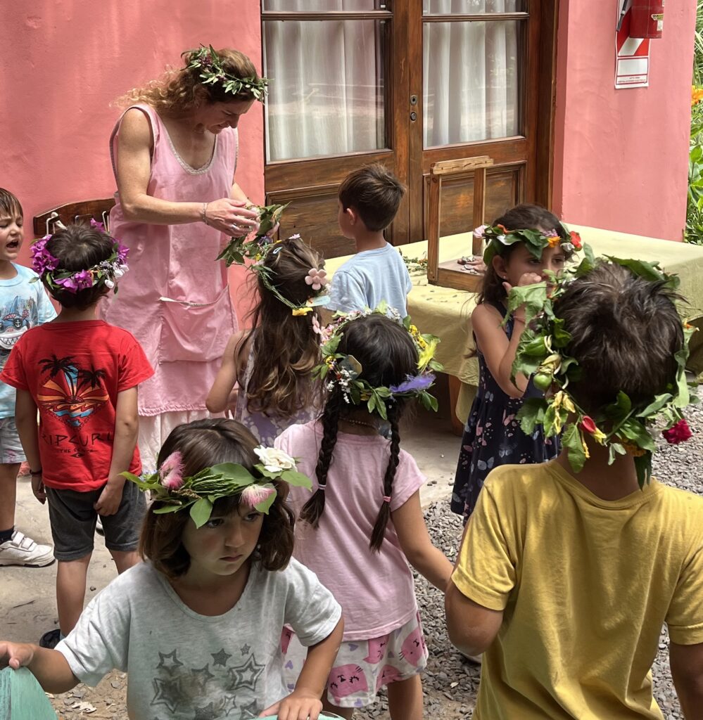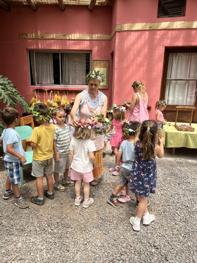 Queremos trenzar coronas de flores y de canciones. Con los niños del jardín la corona se trenzó.